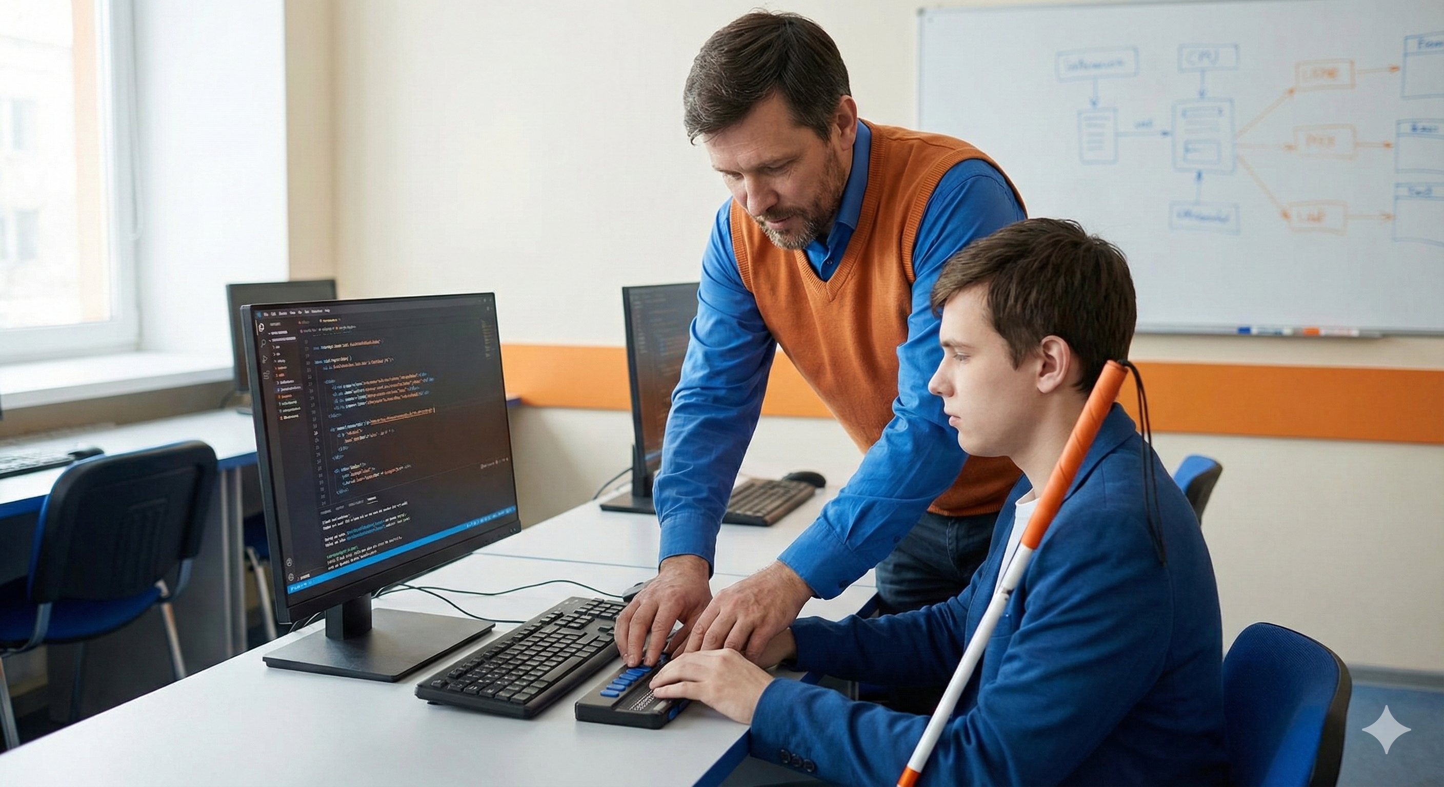 En este taller no solo adaptamos contenido; construimos convivencia. Bajo la filosofía Kyosei (vivir y trabajar juntos por el bien común), descubrirás que la programación es intrínsecamente accesible. Al enseñar a un estudiante ciego a programar, mejorarás tu propia comprensión de la estructura lógica y semántica del código.